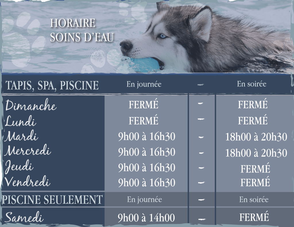 Offerte à tous nos clients, réguliers ou occasionnels, cette option vous permet de réserver une séance privée de baignade de 30 ou 60 minutes, au choix dans notre piscine ou dans notre spa. La baignade en solo est l’opportunité parfaite de passer un moment privilégié avec votre chien, alliant détente et activité physique, tout en renforçant votre lien.