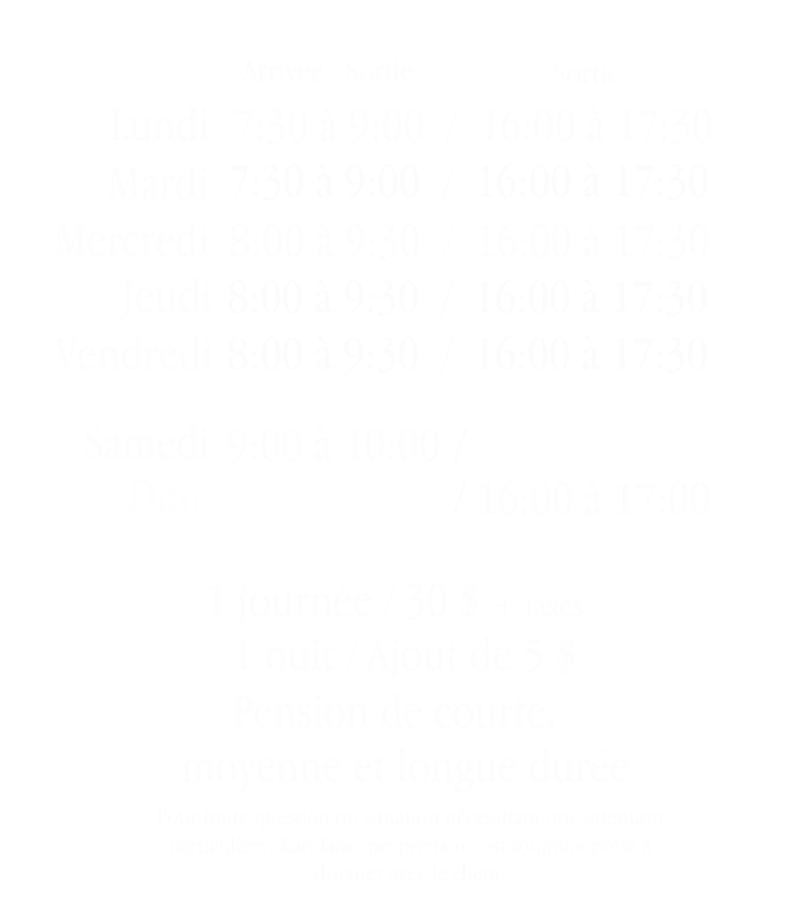 Le temps de l’évaluation est le seul et unique moment où votre chien sera tenu en laisse longue. Ceci est au cas où celui-ci serait porté à fuir ou à démontrer des signes d’agressivité envers nos autres résidents canins.